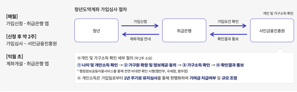 청년 도약 계좌의 가입 대상은 만 19세부터 만 34세 청년 중, 개인소득과 가구소득을 모두 충족하는 청년이 대상입니다. 단, 소득이 없거나 세금 신고 한 소득금액 증명이 불가능한 경우 가입할 수 없습니다. 또한 외국인도 가입이 가능합니다.